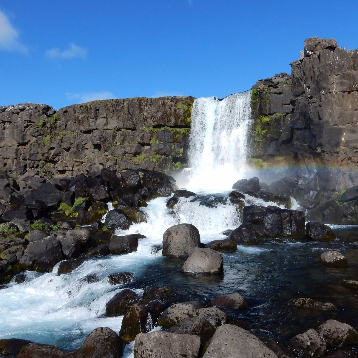 Una pequeña cascada en el parque nacional Þingvellir, en Islandia. Se encuentra en el curso del río Öxará, que en este punto fluye por un campo de lava.